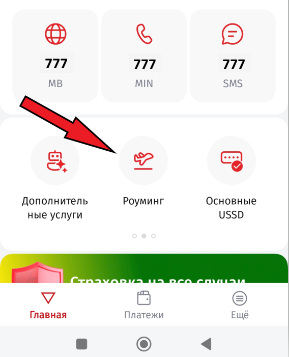 in the main menu, below in the middle, go to the «Roaming» section of the Mobiuz application:
