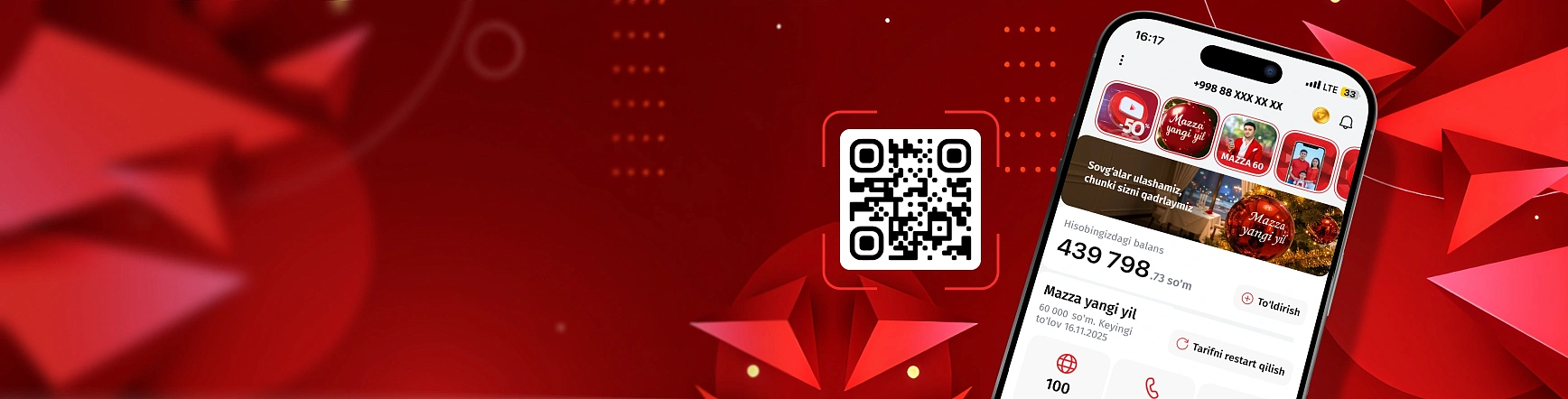 80 000 MBmobil internet oyigaCHEKSIZdaqiqalar O‘zbekiston bo‘yichaCHEKSIZTelegram, Instagram, Facebook, Facebook messenger, Youtube, Vkontakte, Odnoklassniki, WhatsApp, Viber, Teams, Zoom, LinkedIn3500 SMSoyiga80 000 so‘mAbonent to‘lovi oyiga«Xotirjam 60»Mobiuz mobil ilovasi orqali, hamda kompaniyaning ofislarida