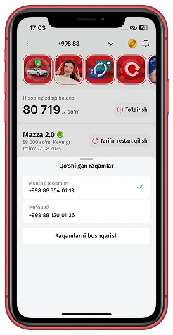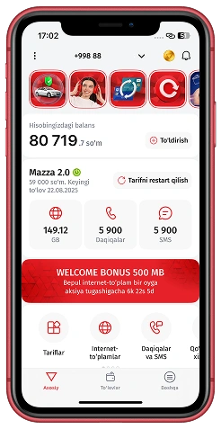 Mobiuz mobil ilovasida Siz mobil hisobingizdagi joriy balansni, shuningdek, daqiqa, MB va SMS hajmini osongina kuzatib borishingiz mumkin.